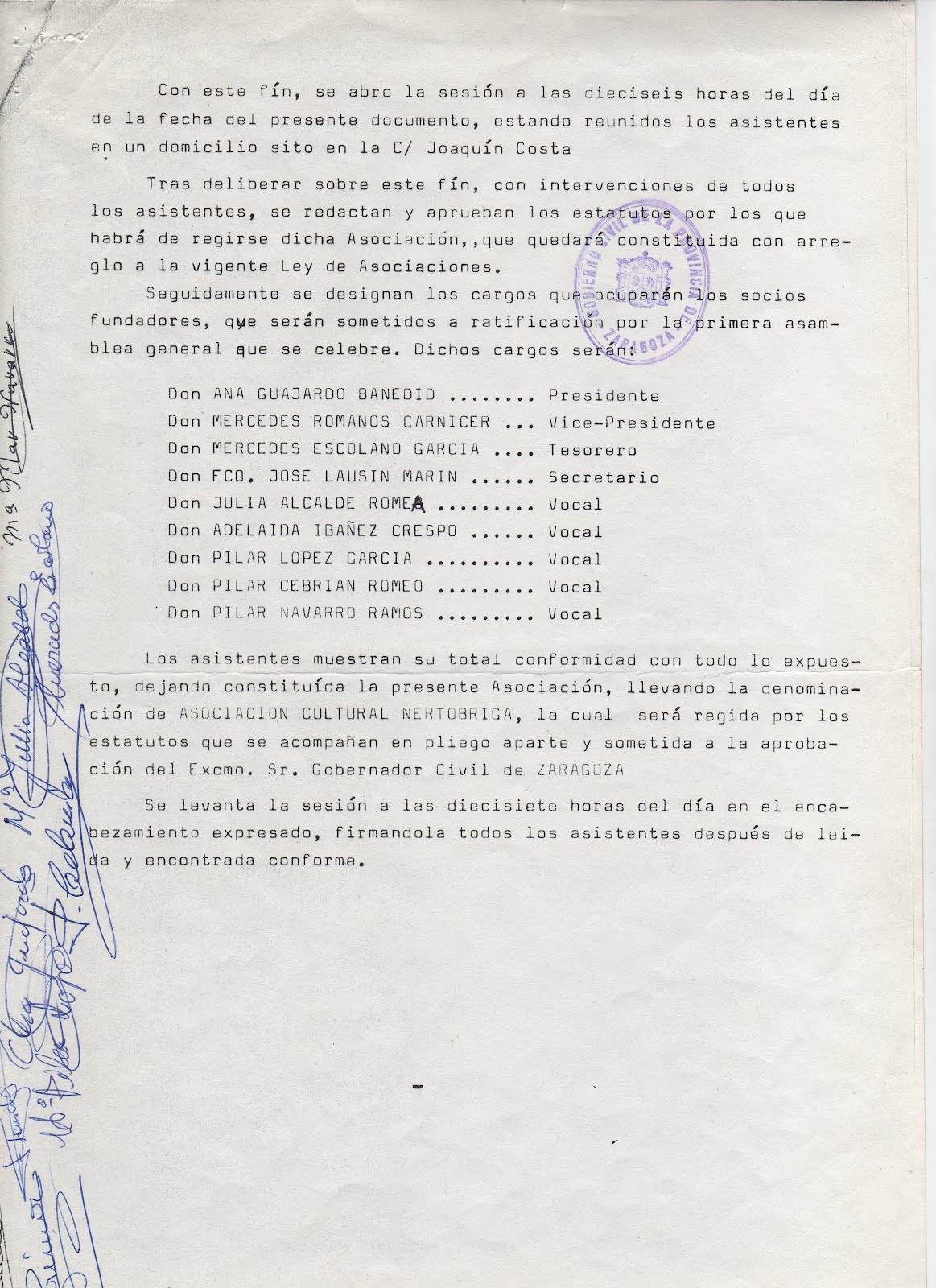 A continuación les presentamos el acta de constitución de la Asociación cultural y social "Nertóbriga", la cual fue fundada el 7 de Noviembre de 1985, por las socias fundadoras: