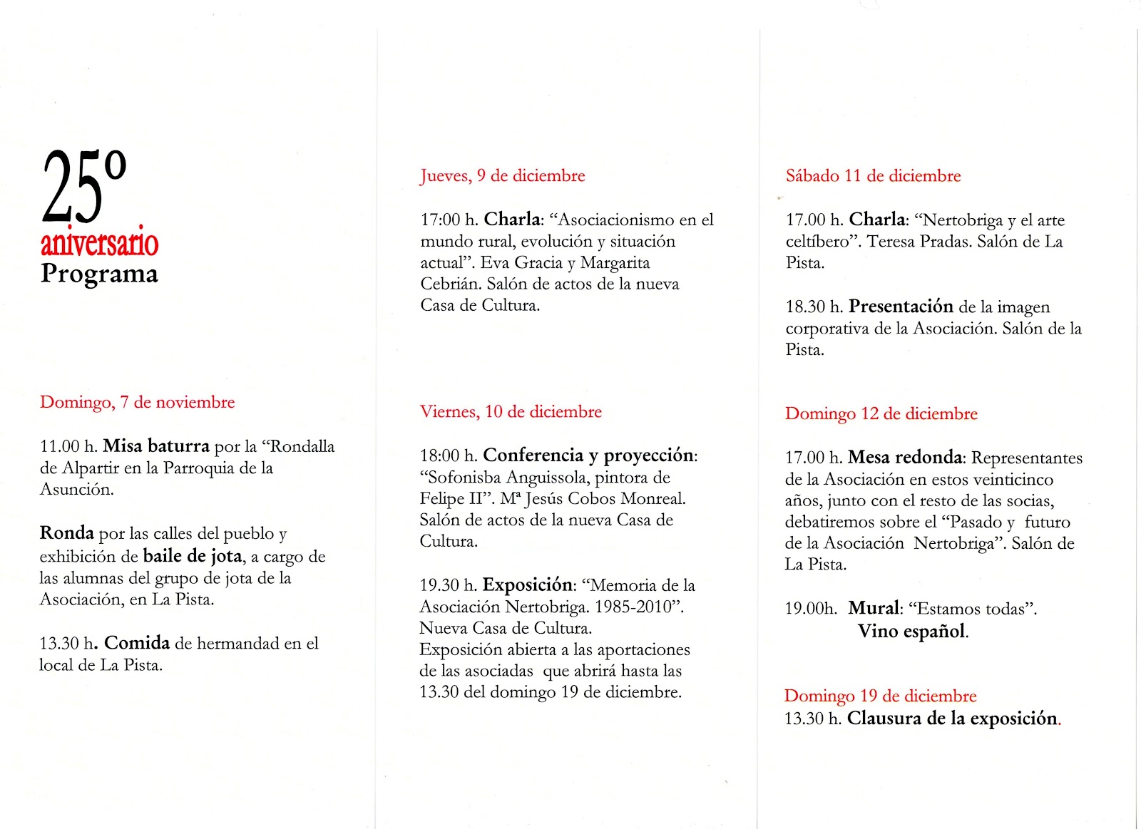 Además se llevaron a cabo varias charlas de "Asociacionimo en el mundo rural, evolución y situación actual", "Sofonisba Anguissola, pintora de Felipe II", "Nertóbriga y el arte celtíbero"; también se realizó una exposición "Memoria de la Asociación Nertóbriga 1985-2010".